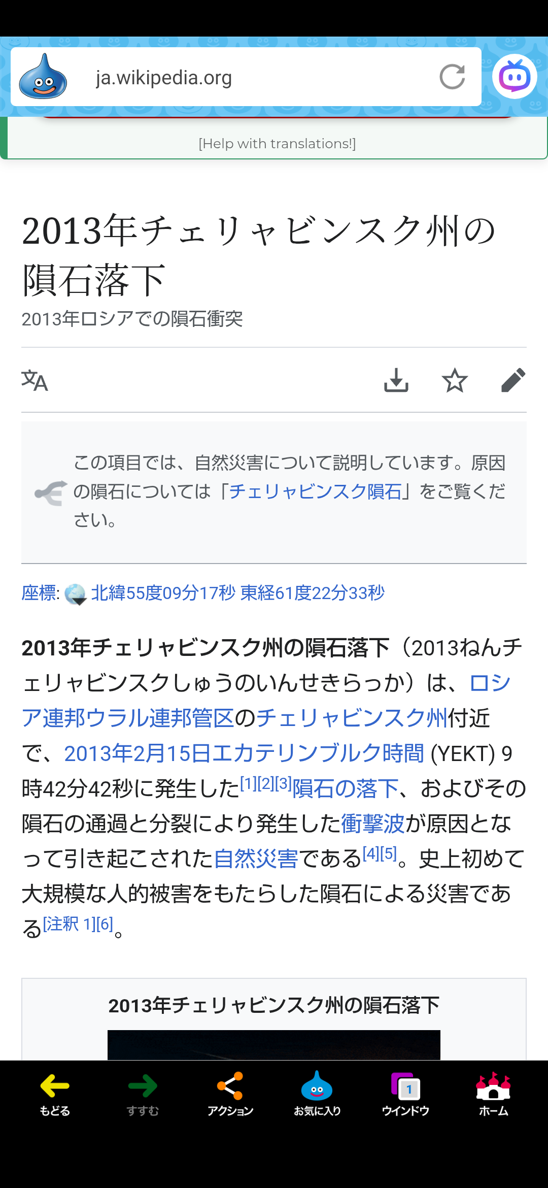 「2013年(平成25年)のこの日、『直径45mの小惑星が地球表面から27,700kmのところを通過した日』、『ロシアチェリャビンスクに隕石が落下して多数の負傷者が出た日』」。🎌