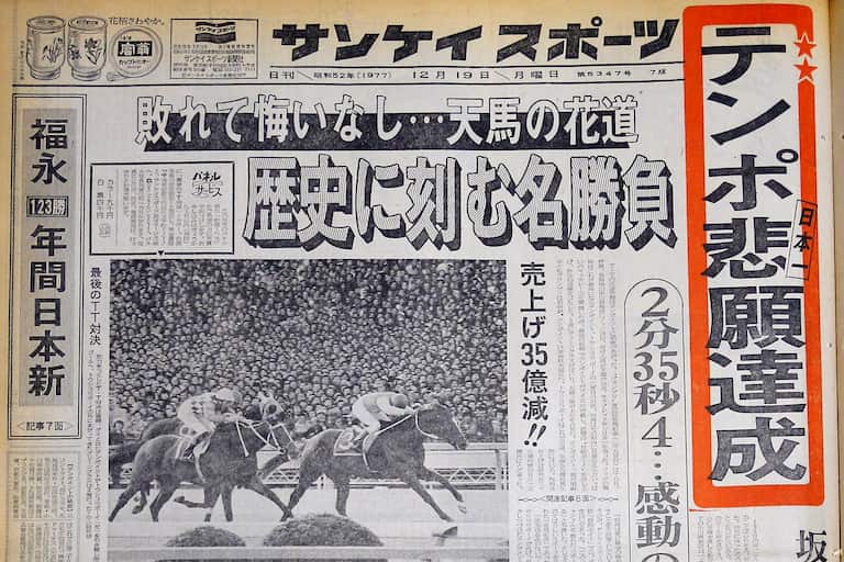 「『テンポイントとトウショウボーイ』のマッチレースとなった1977年(昭和52年)第22回有馬記念の開催日」。🎌