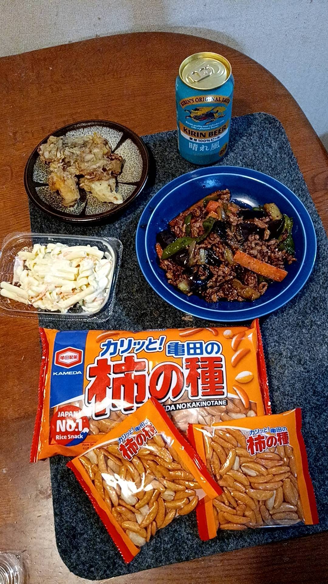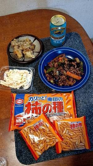 いらっしゃいませ〜🤗 今週も 居酒屋🏮琴美 開店致しま〜す!! さて、本日のメニューは··· 琴美の菜園で採れたおナス🍆を使った麻婆茄子、舞茸の天ぷら、マカロニサラダ、主食の柿ピー です。おナスは寒くなったせいか🤔大っきくならなかったので買ったおナスを加えて作りました😊 では、今宵も琴美のスト脚を見ながら飲んで下さいませ~ 😊