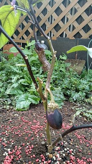 Mちん、アドバイスありがとう〜!!😊 う〜ん、ナス🍆の大きさは6cm位でそれ以上にならないの😅 葉を少し摘んでみたけど。時間も無いしやってみますね!!