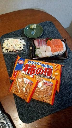 琴美ん!お邪魔しま〜〜〜す😍✋✋ あっ?昨夜のどっかの誰かが作ったエビフライ🍤とは全く違う綺麗で彩りも良く、お店で出されるような美味しそうなエビフライ🍤だ😍💖💖💖 ホタテのお刺身は甘くて美味しいですよね😍💖 か〜ら〜の〜柿ピーですよね…全文