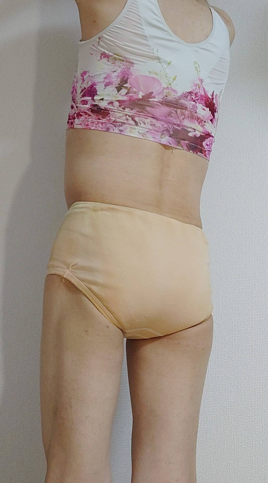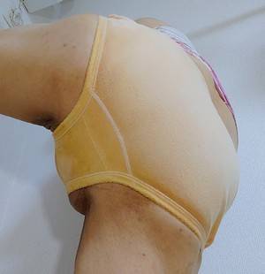 熟成ショーツを履いた画像です。臭いのと、履き心地の悪い事、この上ない。元の白い生地はどこにもありません。