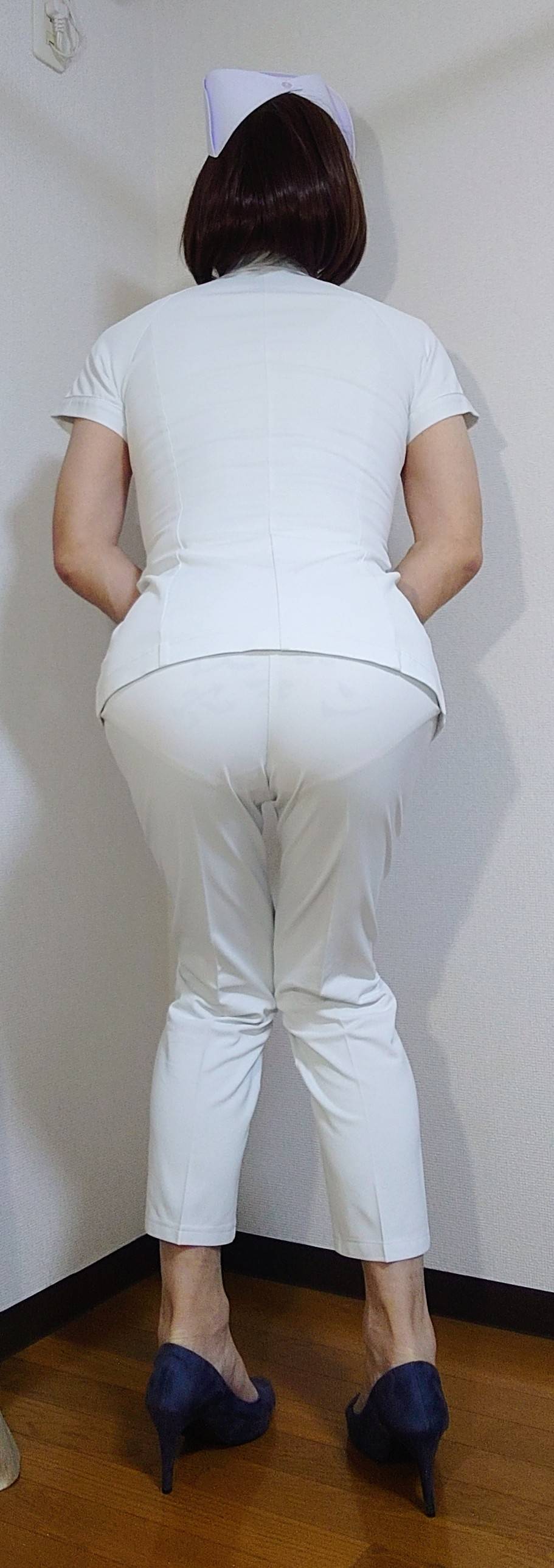新たにナース制服を買いました。サイズを小さくして、パツパツになるようにしました。あとは下着が透けるようにしたかったけど、あまり透け無くて残念!