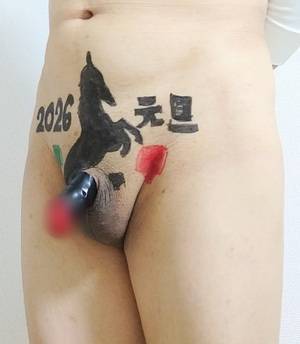 午の絵は、油性マジックで書いています。ペニクリの亀頭は、真っ赤になりました。竿部分は、萎えない様にビニールテープでグルグル巻にしました。