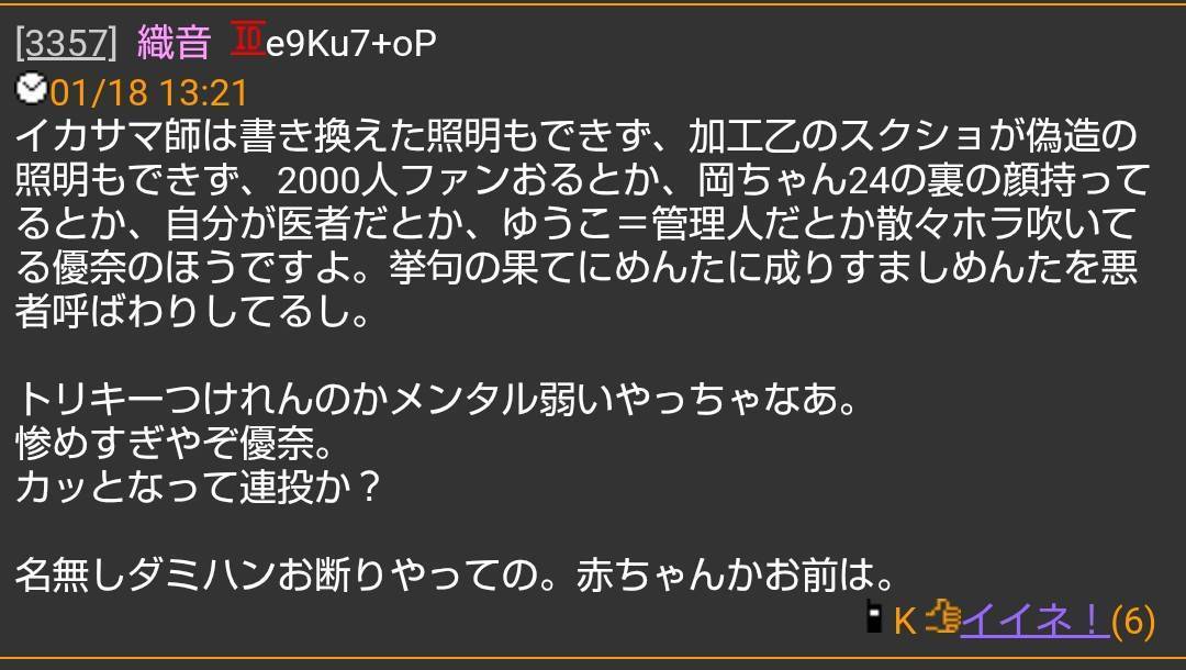 優奈はコテハンではほぼ姿見せてないのに戦うって、、、w