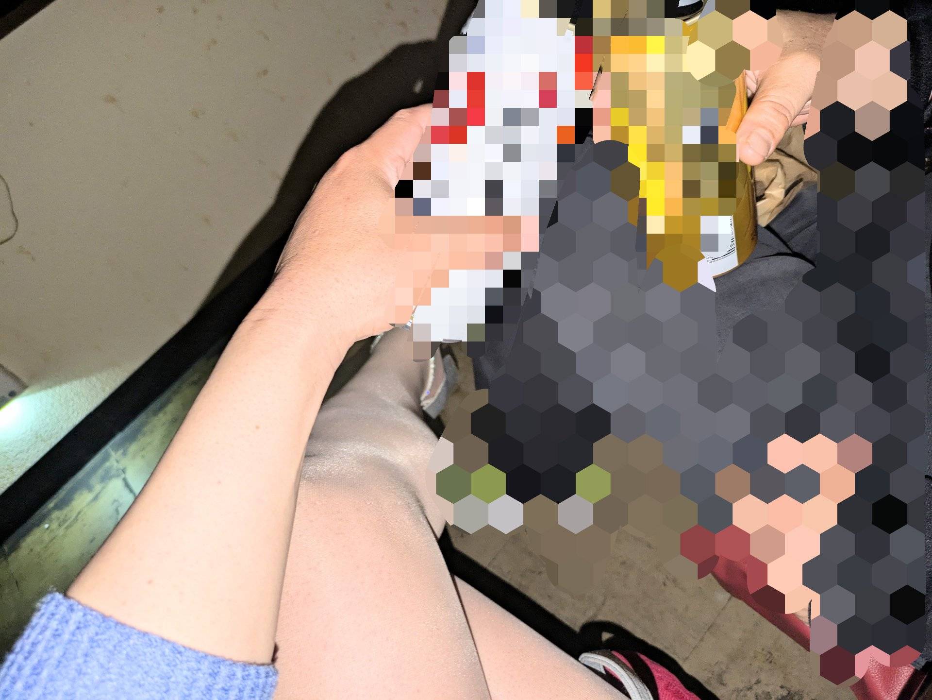 二人のうち1名様が目の前まで来て私の太もも露骨にガン見😢スエットからモッコリわかりポケット手に入れゴソゴソ?あっあぁ💢って少し苦しそうな声出しながら私の片足に触れ少し開脚させポケット手の動きが高速になりスエット中身を見せに来て見るとゴム嵌めて器用にポケットからシコシコ💕あっ逝くぅ💧とゴム先端に白濁色液体が見え重みで先がお辞儀してました。見るだけでいい性癖の人がいるんですね☺