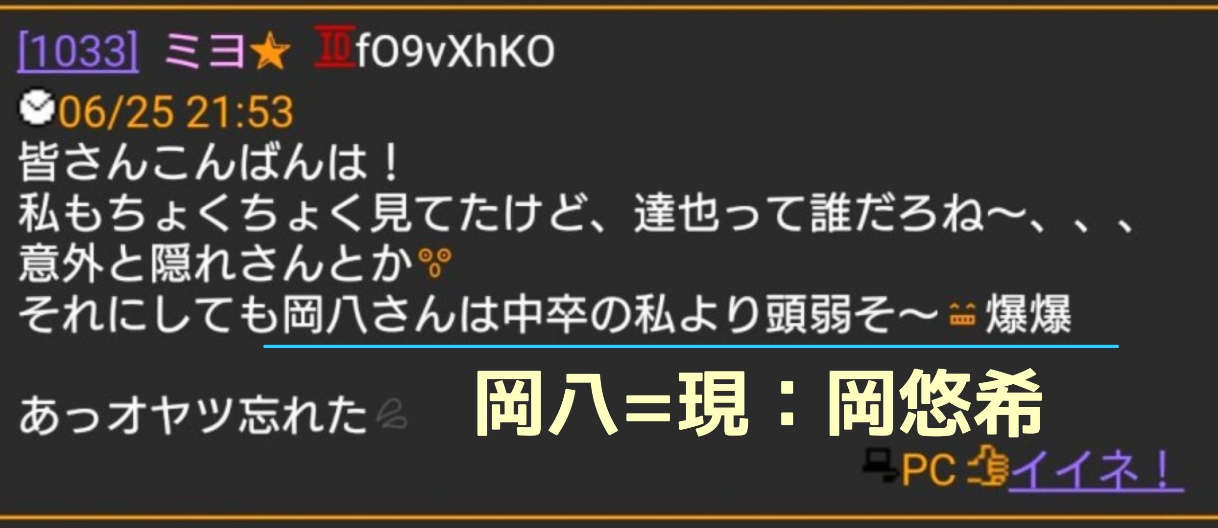 ハッピーの「ミヨ🌟」が岡悠希を「中卒の自分より頭悪い」と指摘しているが、岡は名無しで荒らし回っていて、いつも尻尾を掴まれていたバカだったからさw