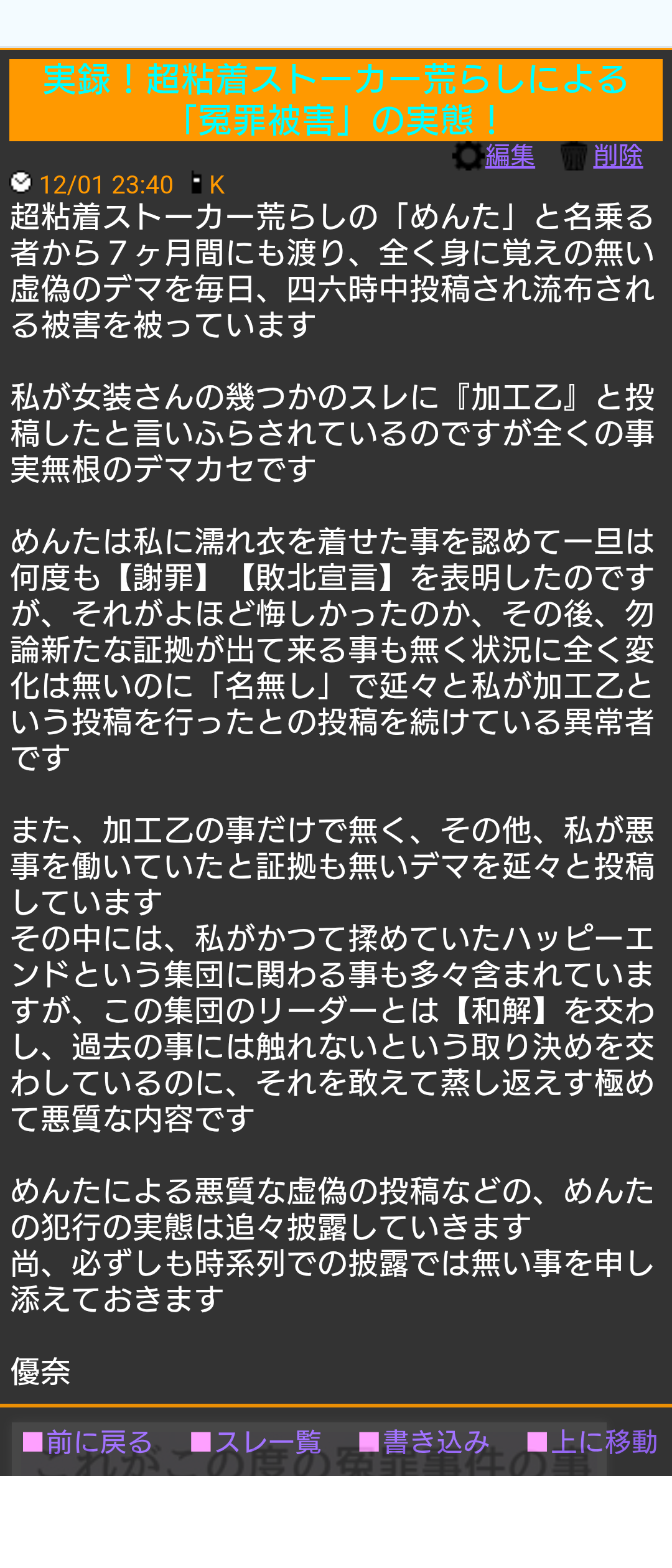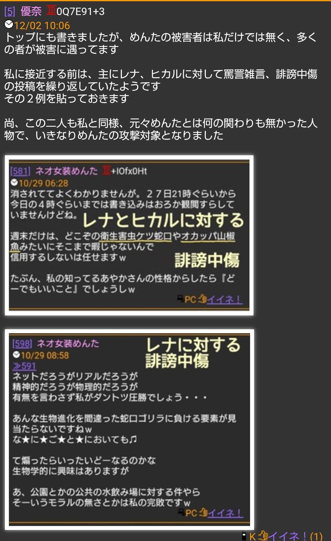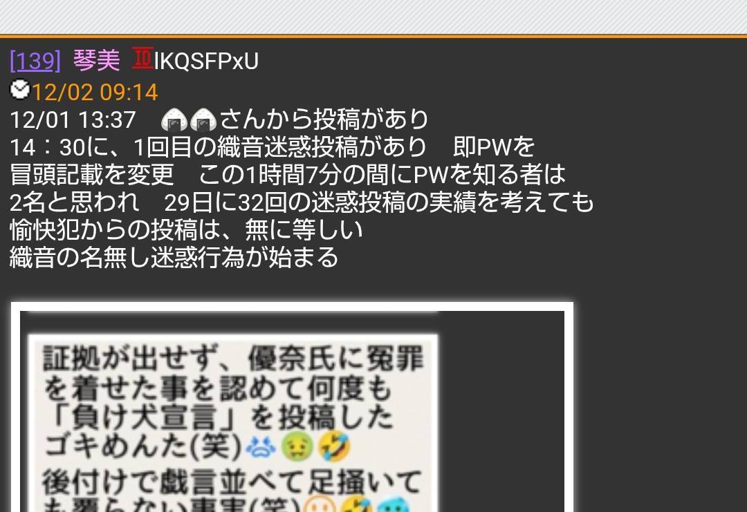 琴美の建てたストーカー被害のスレとレナが建てた名無しの館が削除されずに残っている事で、優奈氏もスレを建てたんじゃないのかな