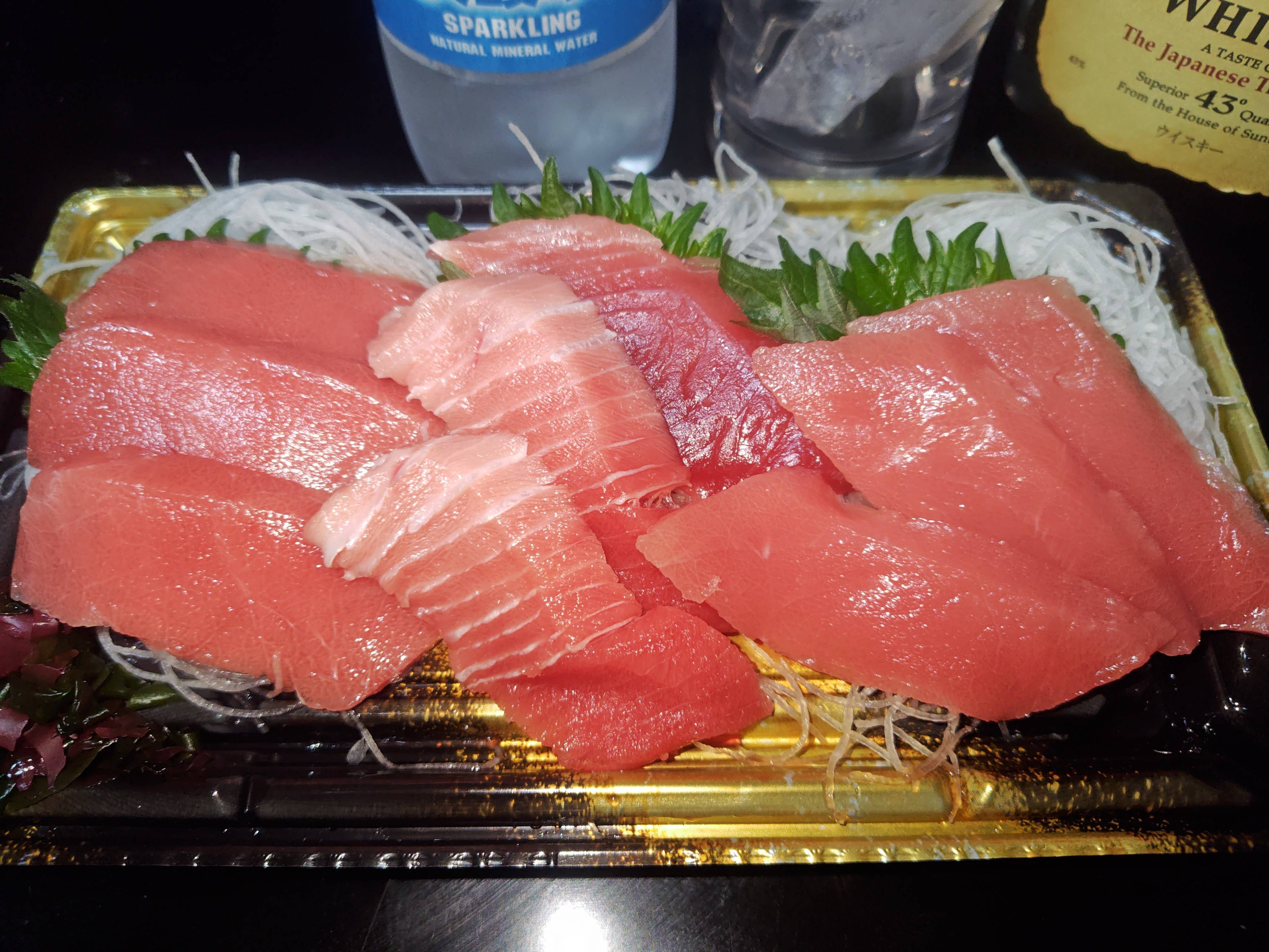 今夜は本マグロ3種盛りと、ボトルキープちぅのオールドを呑みながら