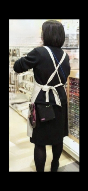 これは俺の妄想だけど多分、この50代後半の熟熟女店員は仕事中に男性客に後ろからスカートを捲り上げられて、少し強めのソフトタッチをされた時の伝線あとかな?