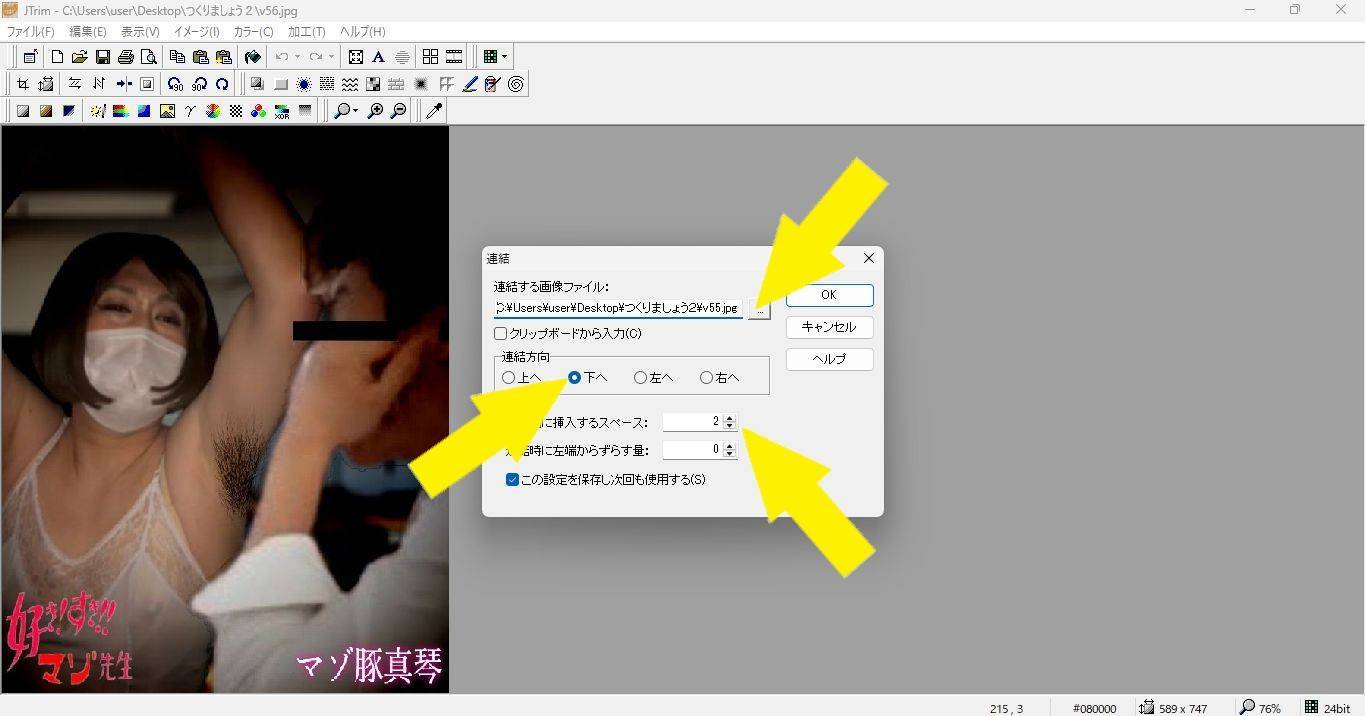 画像を選んで、連結方向、画像間スペースを指定して