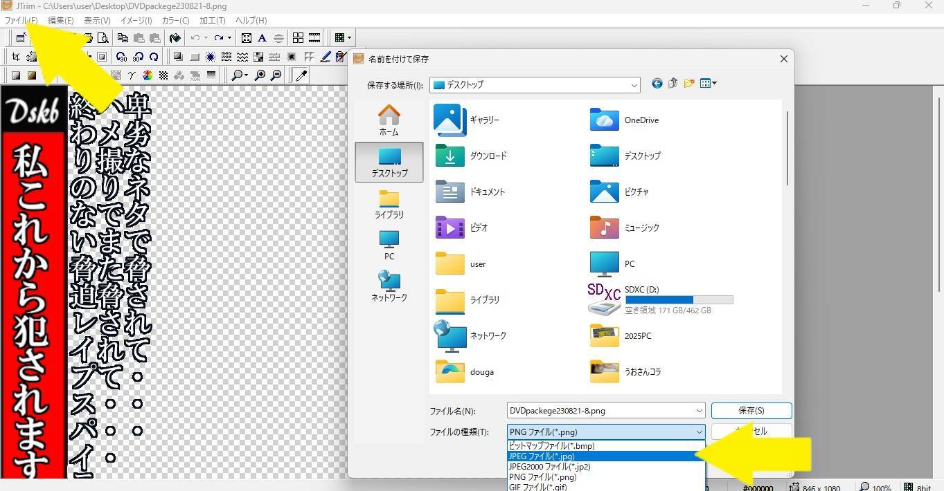 一回JTrimで開いて、ファイル→名前を付けて保存